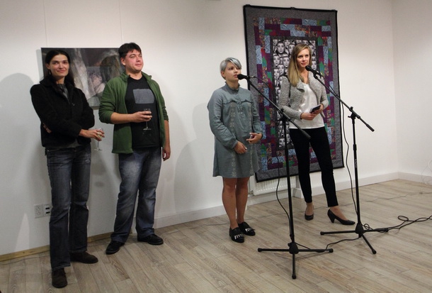Зліва направо: художники Олеся Трофименко та Ярослав Коломійчук, кураторка галереї Американського дому Аліна Комісар, директорка Американського дому Крісті Енн Хофланд.