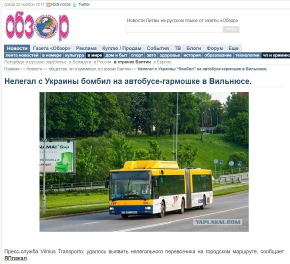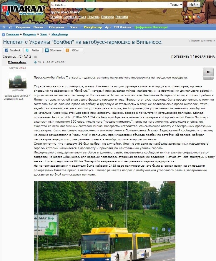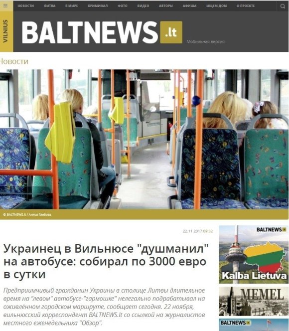 Два російськомовні ЗМІ повідомили, що в годину пік водієм автобуса одного з вільнюських маршрутів нібито прикидався 37-річний громадянин України Валерій Ягелло, який незаконно брав у пасажирів гроші за проїзд. Чоловік начебто прибув до Литви в лютому 2016-го року за туристичною візою з Миколаєва.