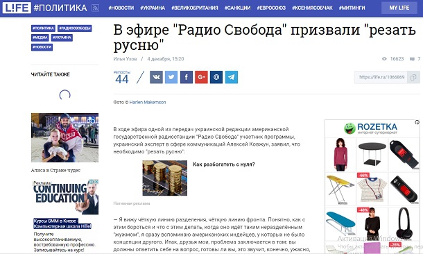 Видання Life! поширило недостовірну цитату експерта в сфері комунікацій та донеччанина Олексій Ковжуна й заявило, що посилання на відповідний ефір «вже видалене» з сервісу YouTube нібито «через порушення правил YouTube щодо розпалювання ненависті».