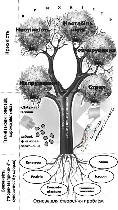 Виявлення протиріч (т.зв. «кореневих причин») в політичній, економічній, культурній, соціальній та інших сферах суспільства країни-цілі є важливим елементом підготовки для стратегічного планування комплексу необхідних заходів та їх інтенсивності.
