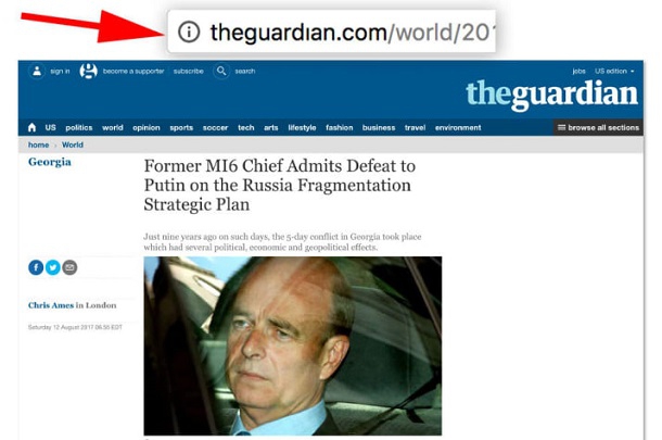 Неправдива стаття, яку намагалися видати за публікацію в The Guardian, присвячена шокуючим зізнанням колишнього голови британської розвідки Джона Скарлета (John Scarlett). Журналісти Buzzfeed News пишуть, що мета її створення (а також кількох інших, які виглядали так, начебто вийшли в Haaretz, The Atlantic та Al Jazeera) — це постачання пропагандистського контенту для російських медіа.