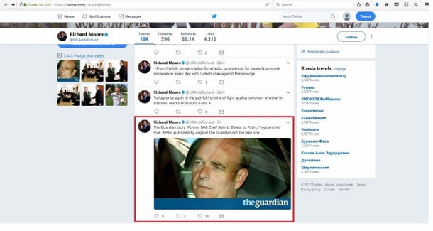 Як зазначає BuzzFeed News, наразі такого твіта у стрічці посла немає. Як і фейкова стаття, він написаний ламаними фразами, не властивими «для будь-якої англомовної людини, не кажучи вже про посла Британії».