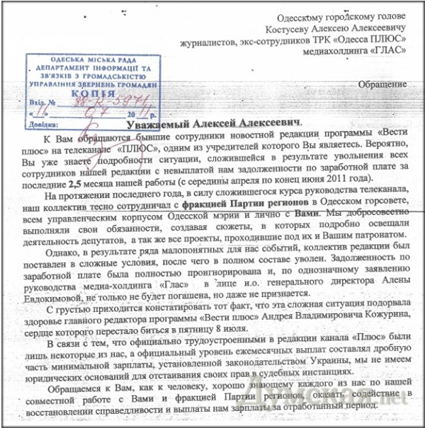«Протягом останнього року, через новосформований курс керівництва телеканалу, наш колектив тісно співпрацював із фракцією Партії регіонів в Одеській міській раді, усім керівним корпусом Одеської мерії і особисто з Вами. Ми сумлінно виконували свої обов’язки, створюючи сюжети, в яких докладно висвітлювали діяльність депутатів, а також всі проекти, що проходили під їх та безпосередньо Вашим патронатом», – також йдеться у зверненні.