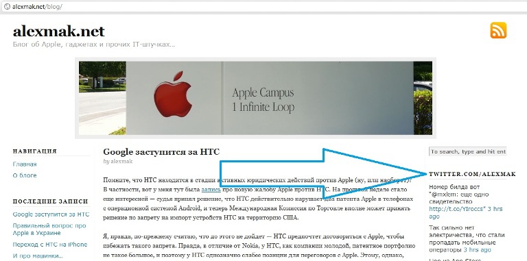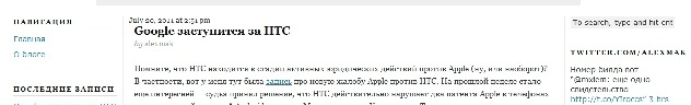 Автор блога активно пишет в Twitter, поэтому на главной странице своего блога он установил информер, который транслирует все твиты автора на блог. Никаких других виджетов здесь нет.