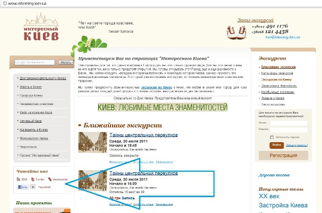 Так же поступил известный блог «Интересный Киев». На главной странице блога показано в одном месте и один раз, в каких соцсетях присутствует этот блог: