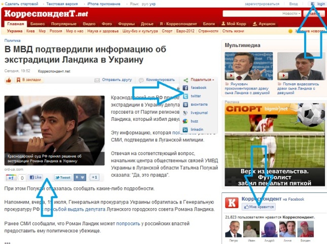 Сайт «Корреспондента» предлагает залогиниться под Facebook. Затем читателям предлагается поделиться статьей в нескольких соцсетях на выбор. Под фотографией можно лайкнуть статью. А справа можно увидеть плагин, который показывает, сколько людей лайкнули страницу сайта – с этого плагина можно попасть на страницу сайта в Facebook.