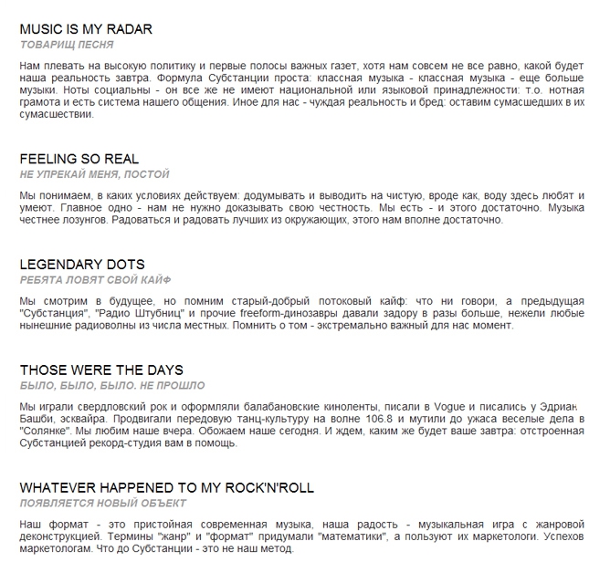«На хвилях станції звучатиме якісна незалежна сучасна музика з-за кордону, «присмачена» найкращими треками вітчизняних музикантів і піснями золотого фонду минулих років», – резюмують хлопці з БИ-2.