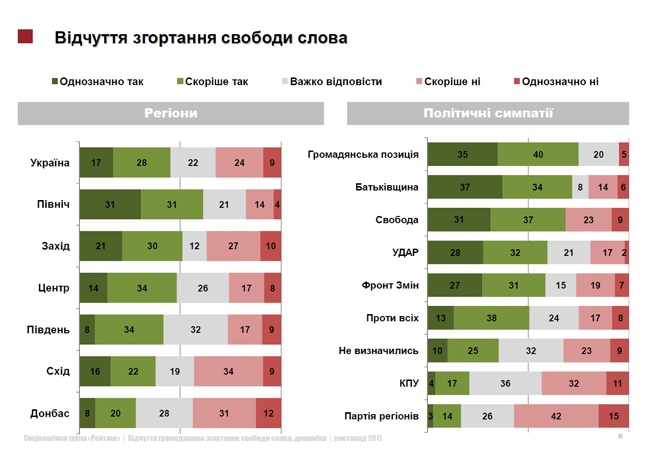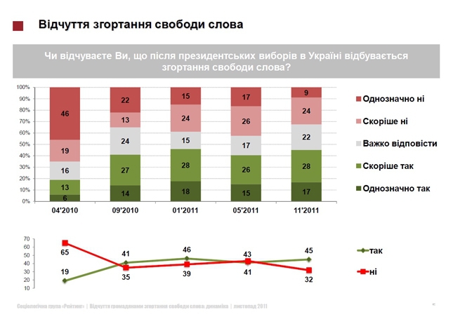 - у листопаді 2011 року фіксується найгірший за останні два роки показник: лише 32% не відчувають згортання свободи слова, з них категорично впевнені у цьому лише 9%. Таким чином після тимчасового покращення показників на початку 2011 року наприкінці року показники знову погіршилися. Варто нагадати, що у квітні 2010 не відчували згортання свободи слова дві третини громадян, сьогодні – вдвічі менше;