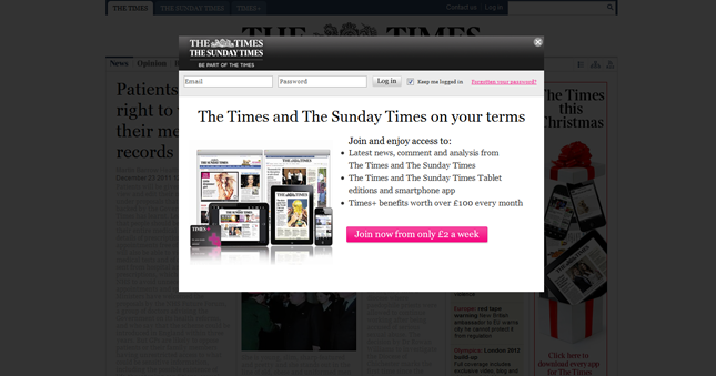 Всплывающие окна. Британская The Times знает, как читателей раздражают всплывающие окна, всплывающие в ста всплывающих окнах. Делать красивые всплывающие окна красиво – важно. Окно появляется в текущем окне, черный фон и фирменная геральдика газеты прилагаются.