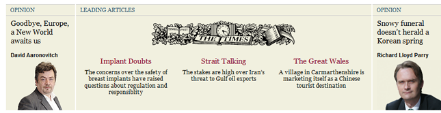 Фирменный шарм. Посредине главной страницы The Times, по структуре похожей на газетную полосу, встроена красивая вставка со старинной геральдикой тогда еще только печатной газеты, что придает изысканности и напоминает об истории издания.