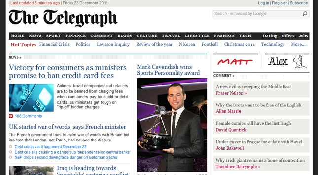 На сайте The Daily Telegraph наряду с серьезным контентом живут вымышленные редакционные персонажи Метт (Matt) и Алекс (Alex). Метт и Алекс занимают на полосе сайта ненавязчивое, но достаточно видимое место в правой стороне экрана, куда глаз читающего слева направо человека попадает во вторую очередь. Слева, куда глаз попадает сразу, естественно, располагается основной контент сайта.
