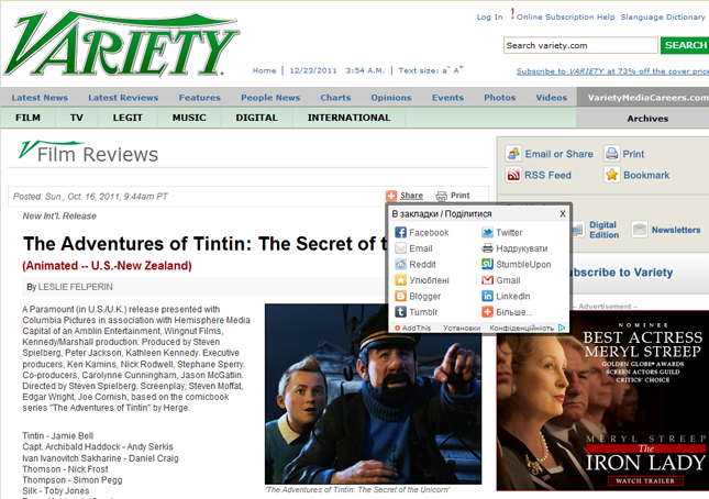 Например, киножурнал Variety прячет их под общую кнопку Share, наводя на которую, мы видим открывающийся список возможных соцсетей.