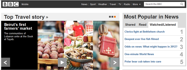 Функциональное удобство. Создатели обновленной версии сайта BBC в своей работе обратили внимание не только на визуальные красивости, но и подумали о стандартах функциональности. Особенно довольны они остались «каруселью», в которую вынесены так называемые Top Stories. Для максимального комфорта и минимизации движений, необходимых для ознакомления с контентом сайта, «карусель» может двигаться автоматически.
