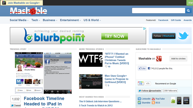 Реклама. Вопрос деликатный. Думается, лучше всего будет просто привести пример. «Что такое хорошо» знает Mashable – рекламы мало, она не слишком режет глаз и к тому же по цветовой гамме гармонирует с общей стилистикой издания.