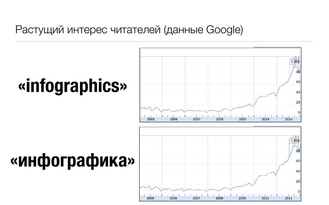 Про все більший інтерес читачів до інфографіки свідчить динаміка запитів у Google за словами «инфографика» та «infographics».