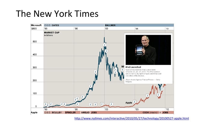 Серед складніших можна згадати візуалізацію від New York Times (це просто-таки гігант візуалізацій в журналістиці), на якій зображено динаміку продажу продуктів софту Microsoft та Apple.