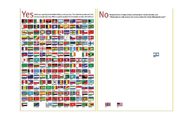 Візуалізація даних вписує інформацію в контекст. Наприклад, можна порівняти ефект від фрази «Тільки США, Великобританія й Ізраїль не підтримують припинення військових дій на Близькому Сході» та від такого зображення:
