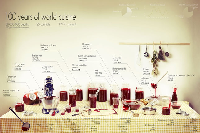38 мільйонів жертв двадцяти п’яти конфліктів у світі за минулих сто років відображено у вигляді червоної рідини на кухні (уявної крові).