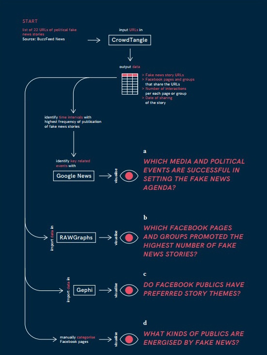 Дослідники використали для прикладу 22 лінки на фейкові статті. Вони проаналізували їх за допомогою розширення для браузера CrowdTangle — цей інструмент дозволяє відстежувати, як контент поширюється в мережі та наскільки ефективно він залучав аудиторію на Facebook, Twitter, YouTube, Instagram та Vine. Потім вони виокремили на таймлайні той проміжок, коли фейки публікувалися з найменшим інтервалом часу. Після цього вони почали шукати ключові релевантні події — проаналізувавши новини за допомогою Google News Search, які були актуальними в той же час.