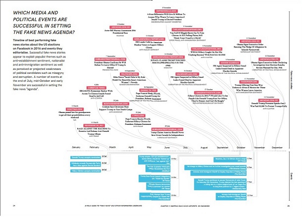 Приклад таймлайну, створеного на основі аналізу даних із CrowdTangle та Google News Search. Він виявив, що фейкові новини перед виборами 2016 року найчастіше використовували теми націоналізму, антиімміграційні настрої. Вони також експлуатували негативні риси кандидатів на пост президента — такі як корумпованість та мізогонію.