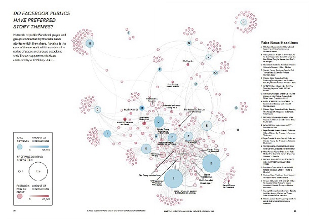 Популярні теми серед публічних сторінок на Facebook. Синіми колами позначено URL фейкових історій. Червоними — сторінка чи група, які з ними взаємодіяли. Чим інтенсивніший колір — тим активнішою була взаємодія між цими компонентами.