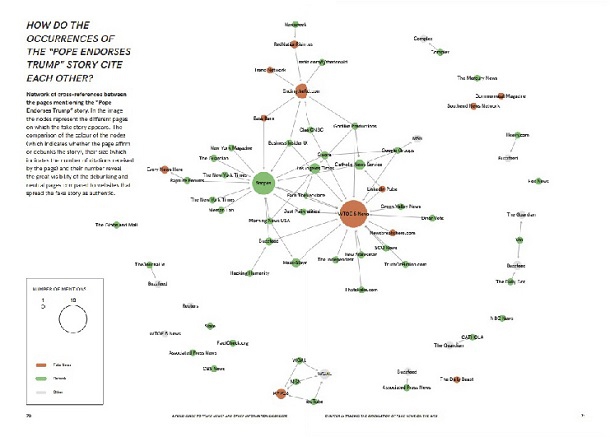 Червоними кружечками позначено фейки, зеленимим — спростування. Як видно на схемі, найбільш видимим було спростування новини про Папу Римського й Дональда Трампа від фактчекерів зі Snopes. Сама фейкова історія була найбільш видимою на WTOE 5 News.