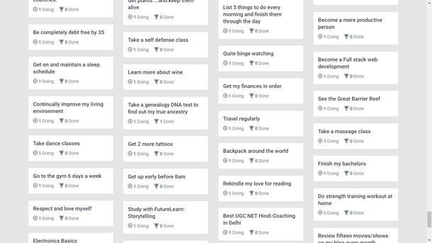 Власне, якщо ти вчиш, скажімо, угорську мову, то стане зрозуміло, що крім тебе таких ще двоє цього року, а до кінця діло ніхто не довів. Вся ця інформація є відкритою та вказаною там же, біля цілі. Потім можна перейти до профілів цих людей, написати їм і все таке. Тобто за бажання можна досягати поставлених цілей разом. Або, якщо нудно, можна просто складати рейтинги найдивніших людських цілей. Наприклад «вивчити якомога більше про Біткоїн», «спробувати сто нових сортів чаю», «гуляти з собакою при температурі вище 20 градусів», «продовжити виконувати попередні 43 обіцянки», «їсти вдома шість ночей на тиждень», «помити ванну», «вивчити гіпноз». Або «написати список всього, що я хочу спробувати». Це, до речі, виглядає найчеснішою ціллю, бо не передбачає життя з понеділка.