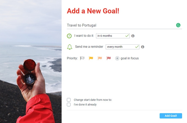 Усе просто: це англомовний сайт, який допомагає сформувати свій список цілей, нагадує про дедлайни і сконтактовує з іншими людьми зі схожими амбіціями. Створюєш профіль (чи заходиш через фейсбук-акаунт), додаєш цілі, бажані дати досягнень, інформуєш програму, коли вона має тобі про все це нагадувати, і... йдеш до успіху. Або не йдеш.