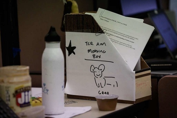 Коробка, в якій зберігаються роздруковані сценарії для ранкових шоу на радіостанції KQED. Раніше для цього в журналістів була окрема система управління.