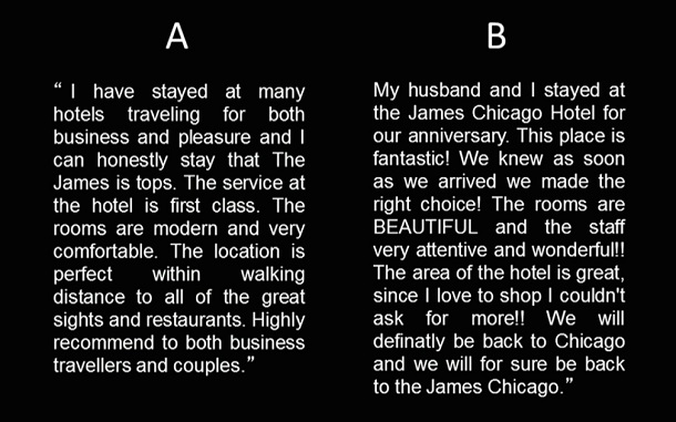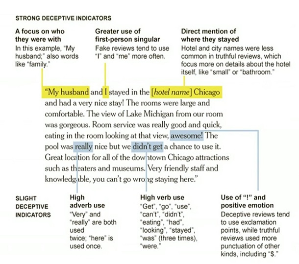 «Той, хто намагається ввести вас в оману, думає про наратив. Він вигадує історії про те, що з ним трапилося. Ми це бачимо й тут, коли нам розповідають, із ким оповідач був і що робив. Він також вживає однину першої особи набагато частіше за людей, які дійсно зупинилися в тому готелі. Тобто він ніби прагне втулити себе в цей відгук, щоб переконати вас, що сам власною персоною там був, – пояснює свої спостереження Хенкок. – На відміну від цих відгуків, відгуки людей, які дійсно фізично були там, містять значно більше просторової інформації. Приміром, про те, наскільки великою була ванна або як далеко від готелю згаданий шопінговий центр».
