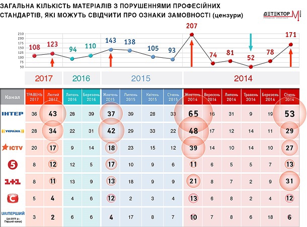 У цьому звіті — зведені результати моніторингів щоденних теленовин центральних телеканалів із найбільшою аудиторією за період із 2014 по травень 2017 років: «1+1», «Інтер», «Україна», ICTV, CTБ, 5 канал. В інфографіку для порівняння включено дані по «UA: Першому» (детально про якість контенту суспільного мовника читайте в наступному розділі цього аналітичного звіту).