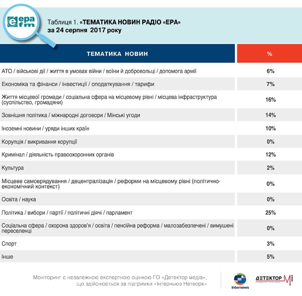 Святковий день наклав відбиток не лише на кількість, а й на тематику новин, які вийшли в ефірі «Ери» 24 серпня. Відзначення Дня Незалежності Україні, а також відгомін урочистостей із нагоди Дня Державного прапора України зумовили значну кількість сюжетів, які містили політичну складову. Загалом, політичних новин цього дня було найбільше — 25 % проаналізованого контенту. В них ішлося про відзначення Дня Незалежності у столиці та регіонах; до цієї ж категорії увійшли новини з ознаками замовності, де фігурували державні діячі та політики. Водночас, 14 % новин, із огляду на присутність в Україні високих закордонних гостей та специфіки свята, стосувалися питань зовнішньої політики, Мінських угод і міжнародної підтримки України країнами-партнерами в боротьбі з російською агресією.