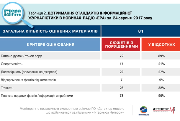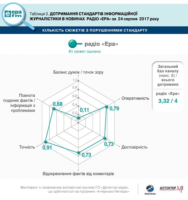 Якщо з точністю в новинах «Радіо Ера» особливих проблем немає — 0,91 бала, — то показники дотримання стандарту повноти інформації — скромні 0,68 бала.