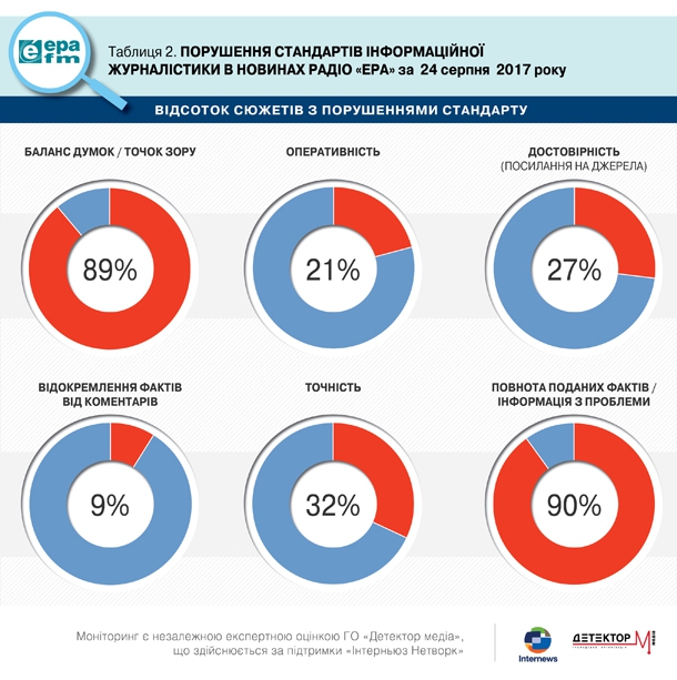 Попри дуже лояльне ставлення до якості новин «Ери», не помітити порушення стандарту достовірності інформації в 27 % проаналізованого контенту неможливо. Навіть якщо зважати на специфіку радійного формату з його прагненням видати максимальну кількість інформації в стислі строки.