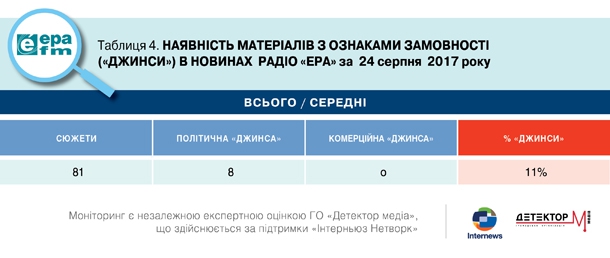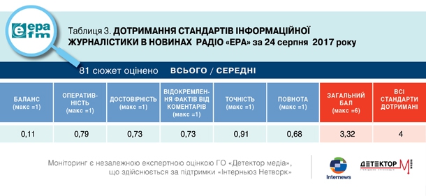 Відповідність новин радіокомпанії фаховим стандартам, які вийшли моніторингового дня, становить 3,32 балів із шести можливих. Ілюстрацією дуже посередніх показників є й те, що тільки чотири повідомлення з 81 відповідали всім стандартам. Причому зазвичай це були сюжети власних кореспондентів «Ери» з регіонів, які намагалися наситити звіти про святкування Дня Незалежності коментарями не лише посадовців, а й пересічних громадян.