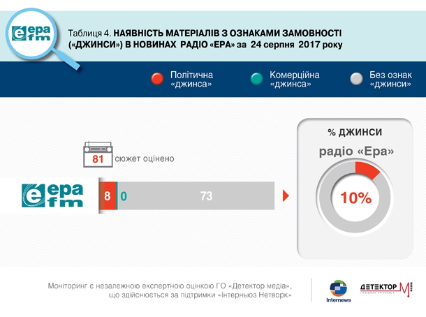 Загалом, неоперативним були всі новини «Ери», що виходили в ефірі радіокомпанії до 10:00, — це повтори сюжетів минулого дня. Скажімо, ще 23 серпня в інтернет-ЗМІ вийшла новина про те що, «40 % українців проголосували б за членство країни в НАТО». КМІС, який проводив це дослідження, опублікував реліз із результатами також 23 серпня. А на «Ері» новина вперше прозвучала о 16:00 24 серпня.