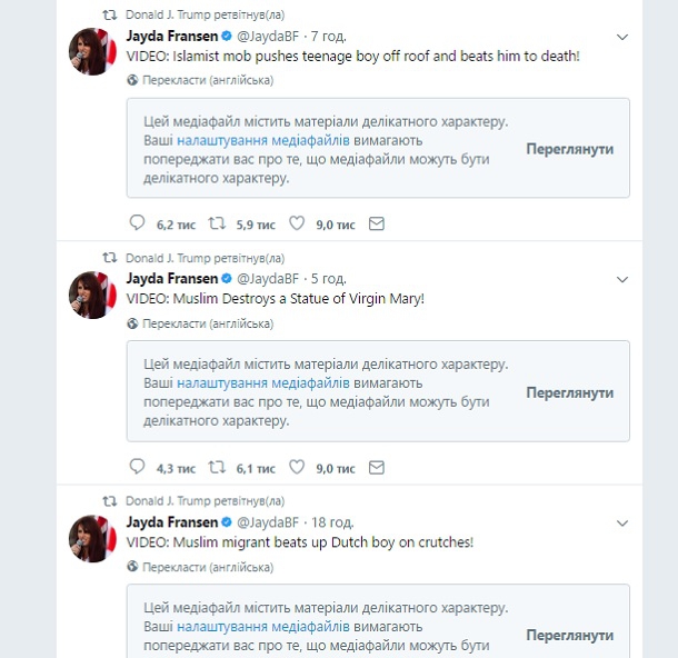 Перше поширене керівником США відео належить одному з лідерів руху «Британія – перш за все» – політикині Джайді Франсен. Вона заявляє, що на одному з роликів показано, що мігрант-мусульманин напав на чоловіка на милицях. Одразу після поширення цього допису на сторінці президента США з'явилося ще два репости Джайді Франсен із подібними роликами.