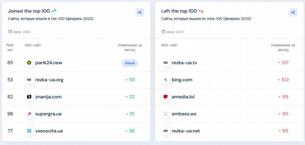 Як свідчить аналітика SimilarWeb, заблоковані ресурси стрімко втрачають трафік. Наприклад, сайт rezka.ag, що посідав дев’яте місце у 50-ці найпопулярніших вебсайтів України у вересні 2023 року, в лютому 2025 року опинився вже на 41-му місці. Найбільш рейтингове дзеркало HD Rezka, rezka-ua.tv, також упало з 10 місця на 517 позицій у рейтингу SimilarWeb.