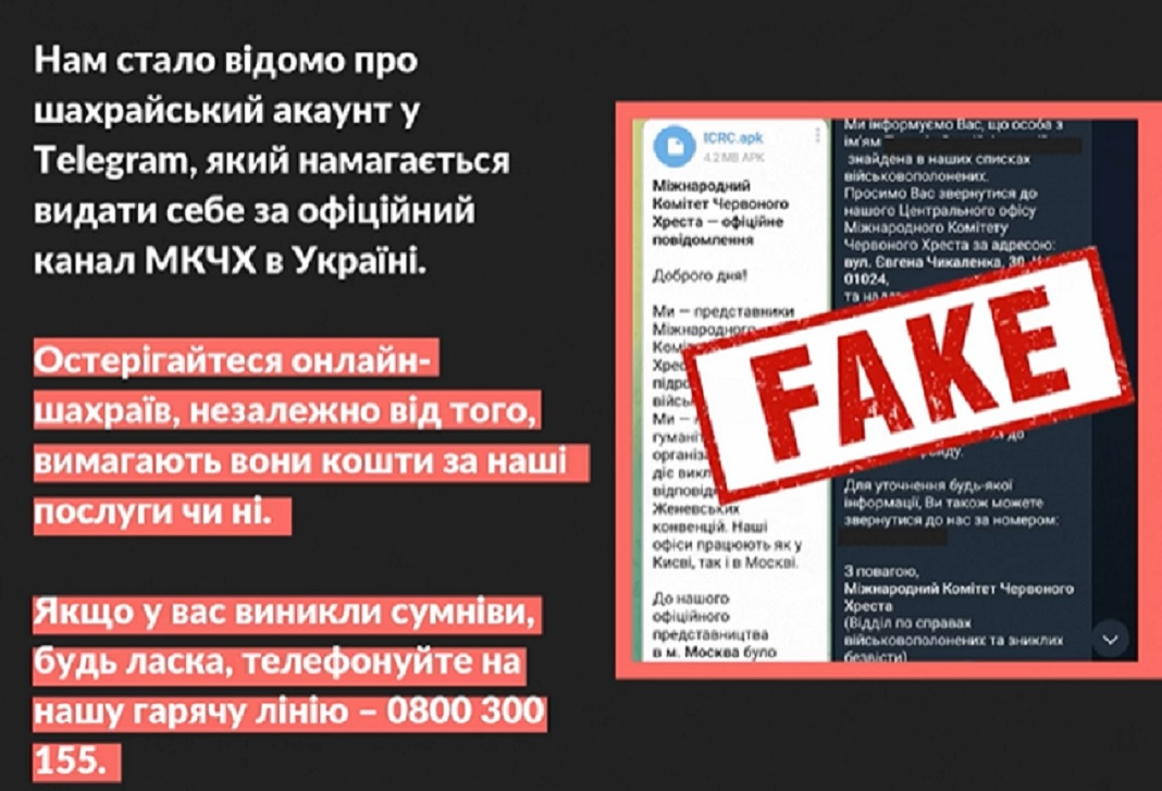 «Остерігайтеся онлайн-шахраїв, незалежно від того, вимагають вони кошти за наші послуги чи ні», — наголосили в МКЧХ.