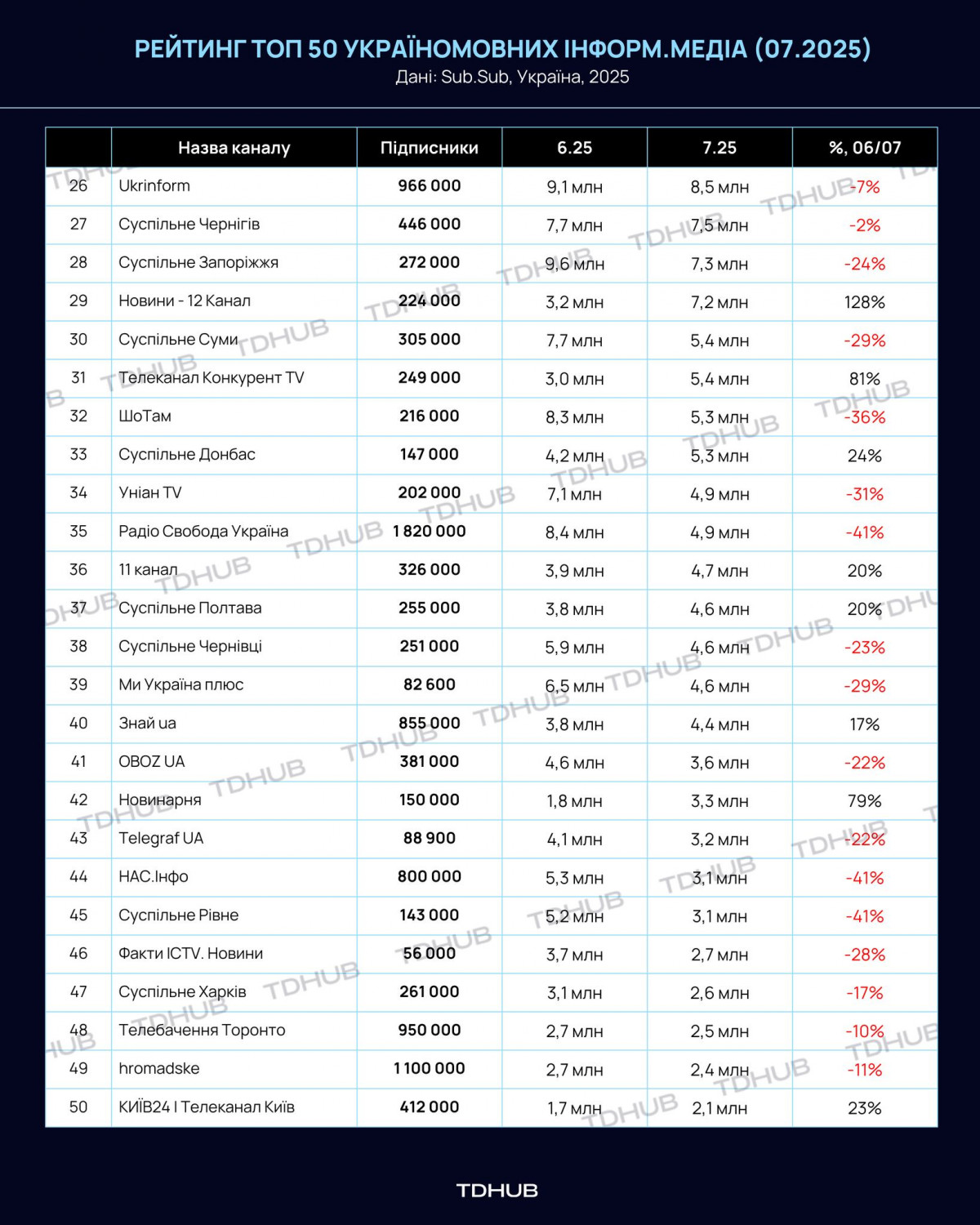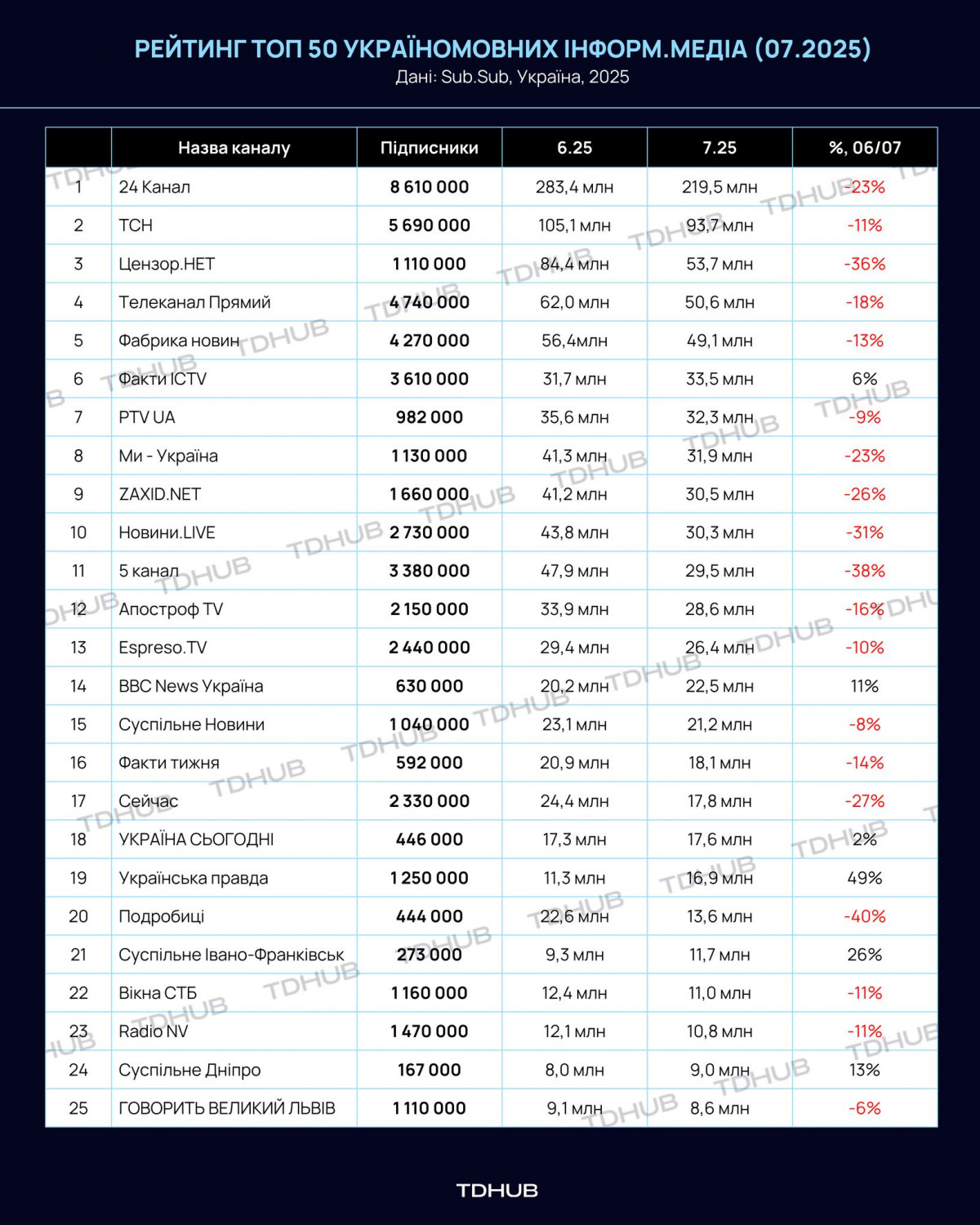 Більшість українськомовних інформаційних ютуб-каналів втратили перегляди в липні 2025 року — як у порівнянні з червнем, так і з аналогічним періодом минулого року. Про це повідомили в агентстві Tyshchuk Digital HUB.