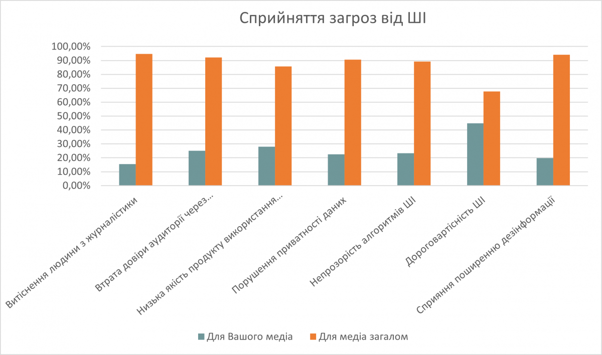 Дослідження виявило критичний рівень сприйняття загроз від використання ШІ. Понад 85% опитаних вважають проблематичними для медіа загалом такі аспекти, як витіснення людини з журналістики (94,75%), сприяння поширенню дезінформації (94,17%), втрата довіри аудиторії (92,13%) та порушення приватності даних (90,67%).