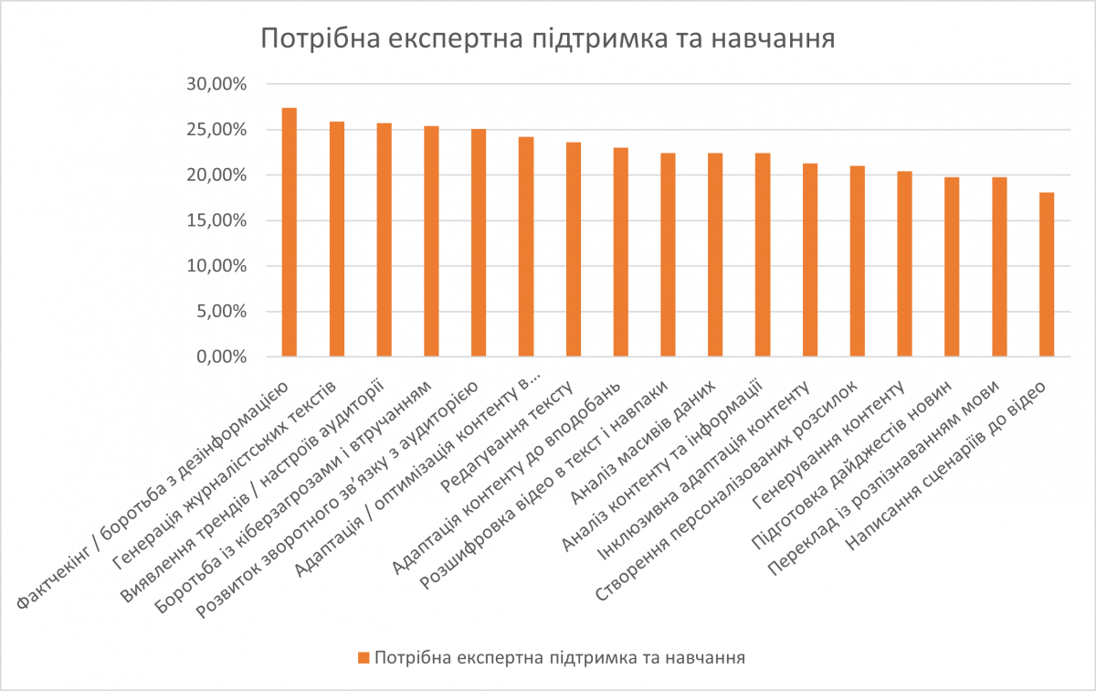 Найбільший попит на експертну підтримку стосується фактчекінгу та боротьби з дезінформацією (27,4%), генерації журналістських текстів (25,9%), виявлення трендів і настроїв аудиторії (25,7%) та боротьби з кіберзагрозами (25,4%).