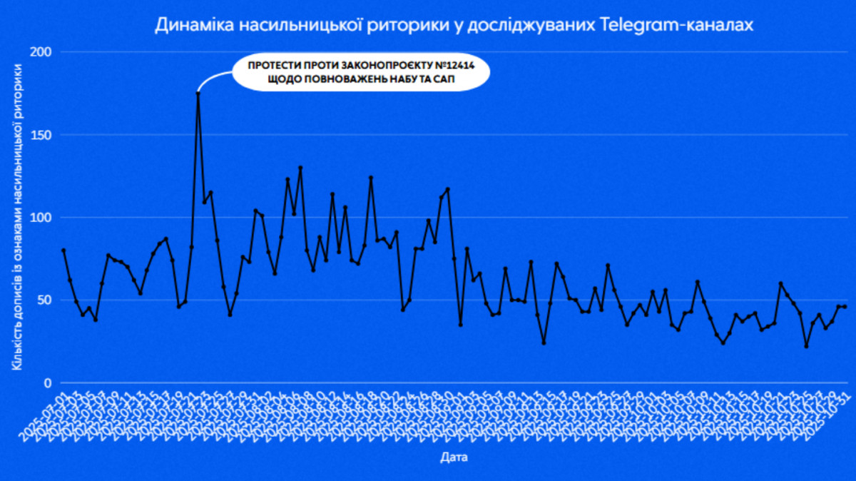 Водночас присутність контенту з насильницькою риторикою була системною, адже за частотою ці дописи рівномірно розподілені протягом усіх трьох місяців спостереження (за винятком сплесків, повʼязаних із яскравими інфоприводами на кшталт протестів щодо НАБУ і САП)», — йдеться у звіті «Опори».