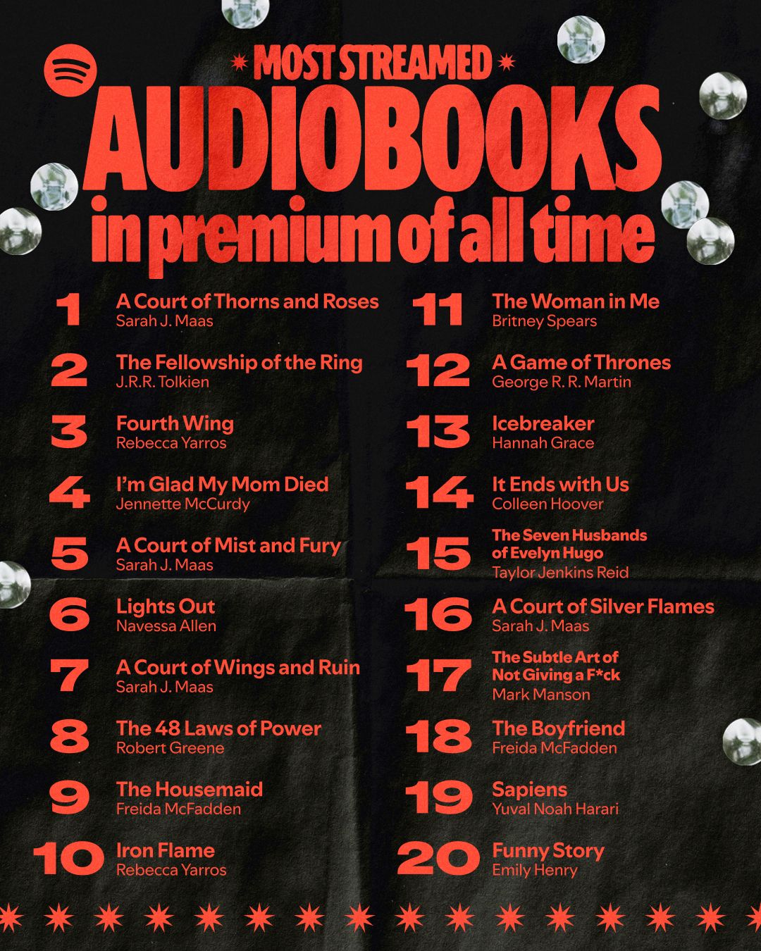 Найбільш прослуховуваною аудіокнигою серед користувачів Premium стала «Двір шипів і троянд» Сари Дж. Маас. На перших місцях рейтингу також опинилися «Братство персня» Дж.Р.Р. Толкіна, «Четверте крило» Ребекки Ярос і «Я рада, що моя мама померла» Дженнет Маккарді.