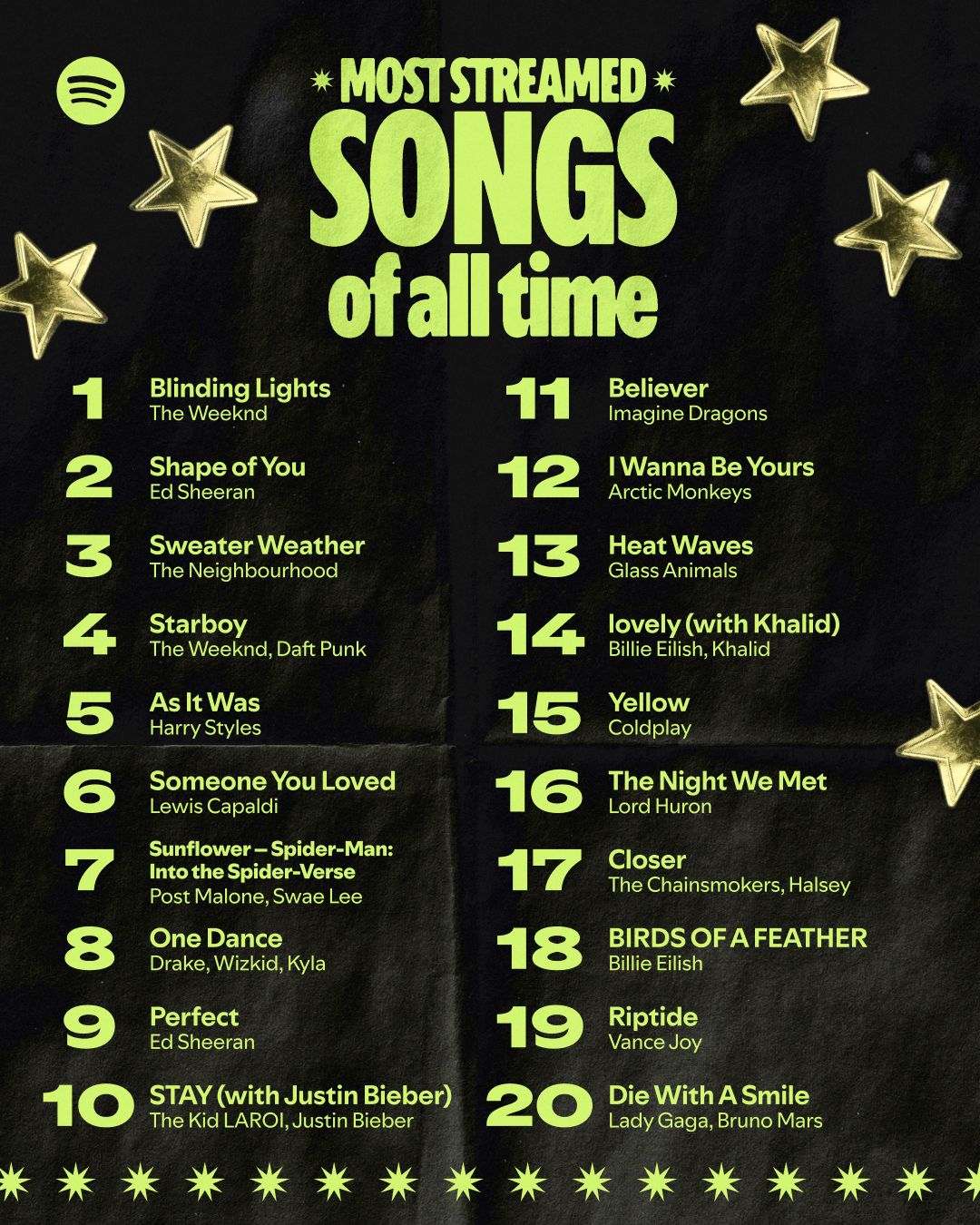Рейтинг найпопулярніших артистів за всю історію очолила американська співачка Тейлор Свіфт. До пʼятірки лідерів також потрапили Bad Bunny, Drake, The Weeknd і Аріана Гранде. Крім них, у списку є Біллі Айліш, Емінем, Каньє Вест, Ріанна та південнокорейський гурт BTS.