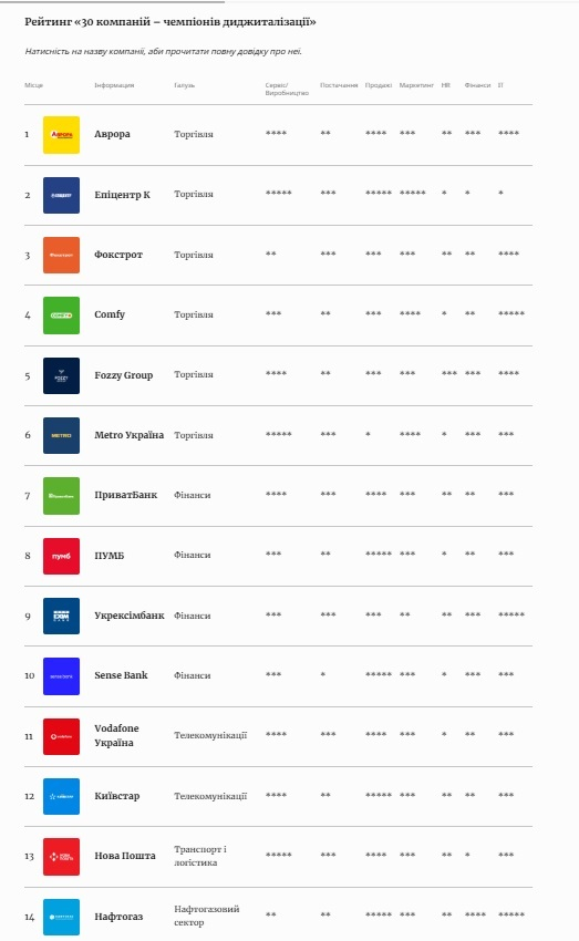 Для кожної компанії було розраховано індекс диджиталізації на основі 26 критеріїв. 30 компаній із найвищим індексом увійшли до списку «Чемпіони диджиталізації».