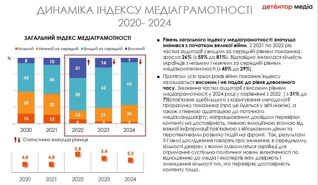Протягом усіх трьох років війни показник індексу залишається високим і не падає до рівня довоєнного часу. Зниження частки аудиторії з високим рівнем медіаграмотності у 2024 році у порівнянні з 2022-м (з 31% до 7%) пов'язане здебільшого з коригуванням методології, а також з певною адаптацією до поточного медіаландшафту, напрацьованим досвідом перевірки контенту на достовірність, певною емоційною втомою від важкої інформації, пов’язаної з військовими діями та перспективами розвитку подій на фронті.