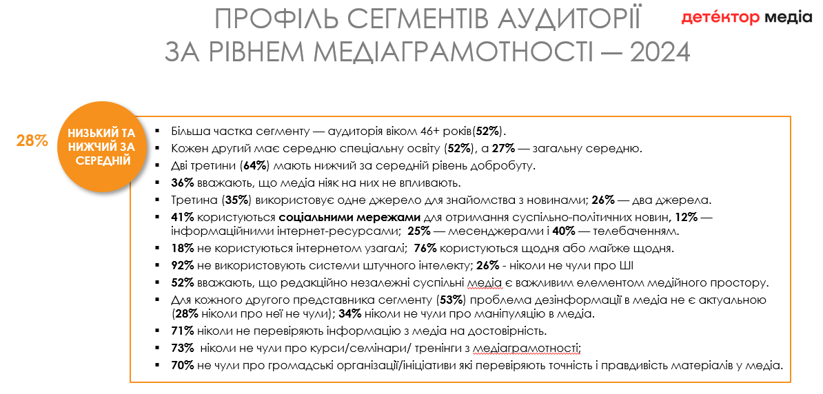 Знизилася частка аудиторії з високим і вищим за середній рівнем цифрової компетентності — з 55% до 48% (2023 vs. 2024).