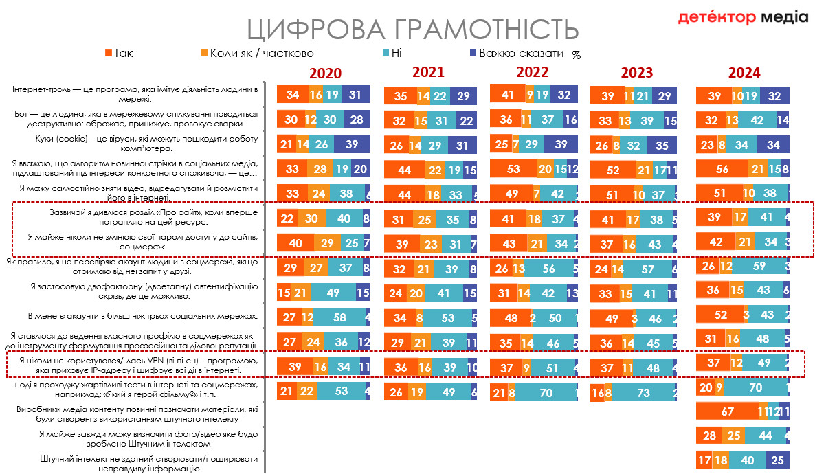 За останній рік рівень медіаграмотності змінився: частка людей з вищим за середній рівнем зменшилася з 76% до 72%. Проте дослідники зазначають, що це пов'язано з оновленням методології, зокрема розширенням індикаторів субіндексу цифрової грамотності показниками сприйняття і використання штучного інтелекту.