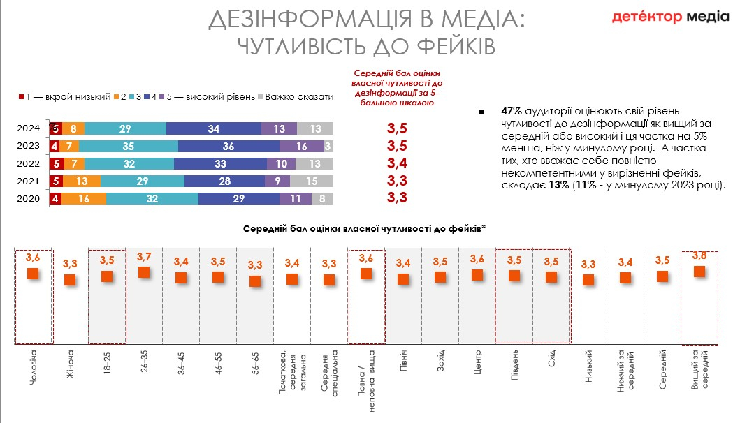 Також 47% аудиторії оцінюють свій рівень чутливості до дезінформації як вищий за середній або високий, і ця частка на 5% менша, ніж у попередньому році. А частка тих, хто вважає себе повністю некомпетентними у вирізненні фейків, становить 13% (11% у 2023 році).